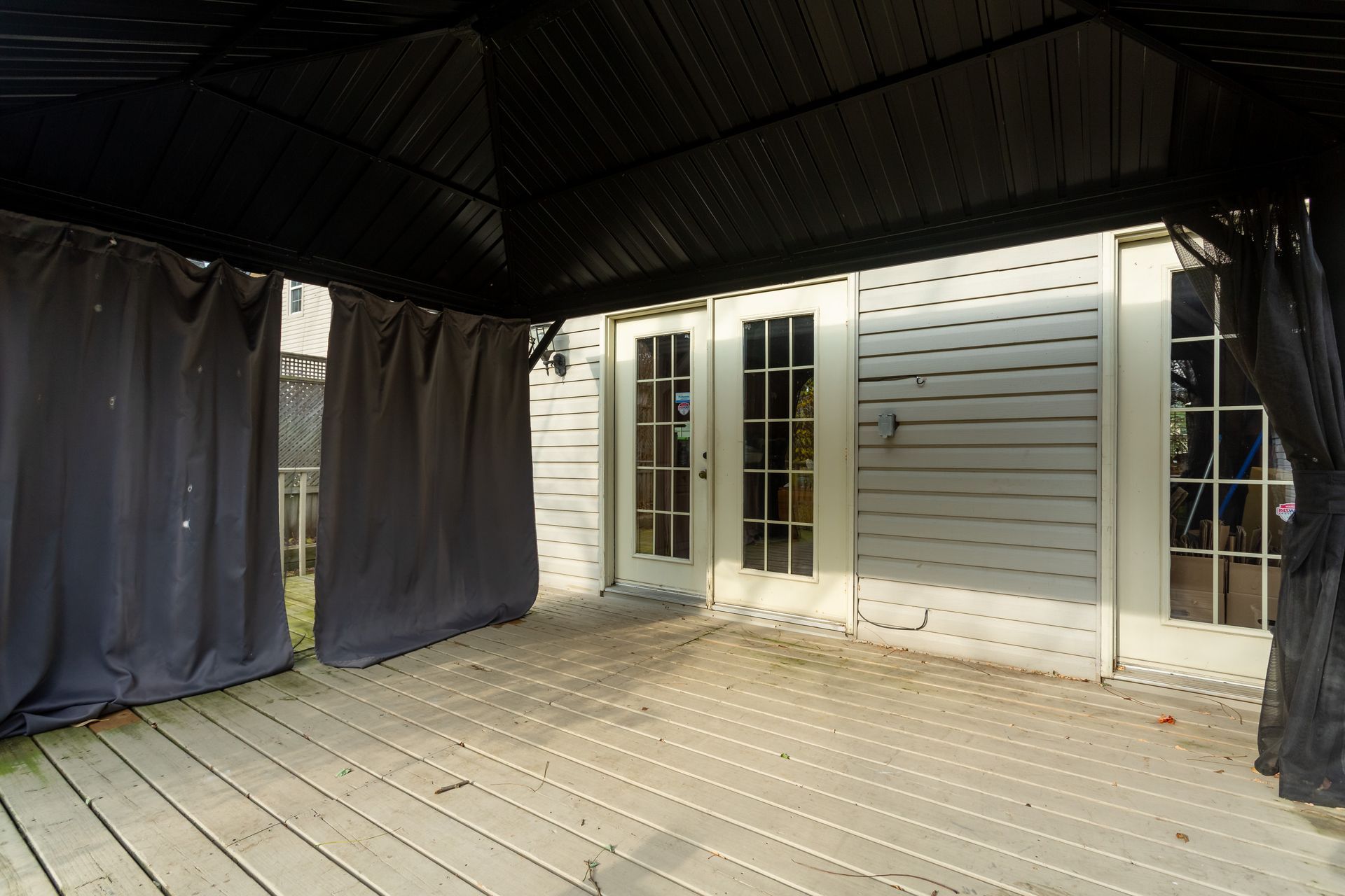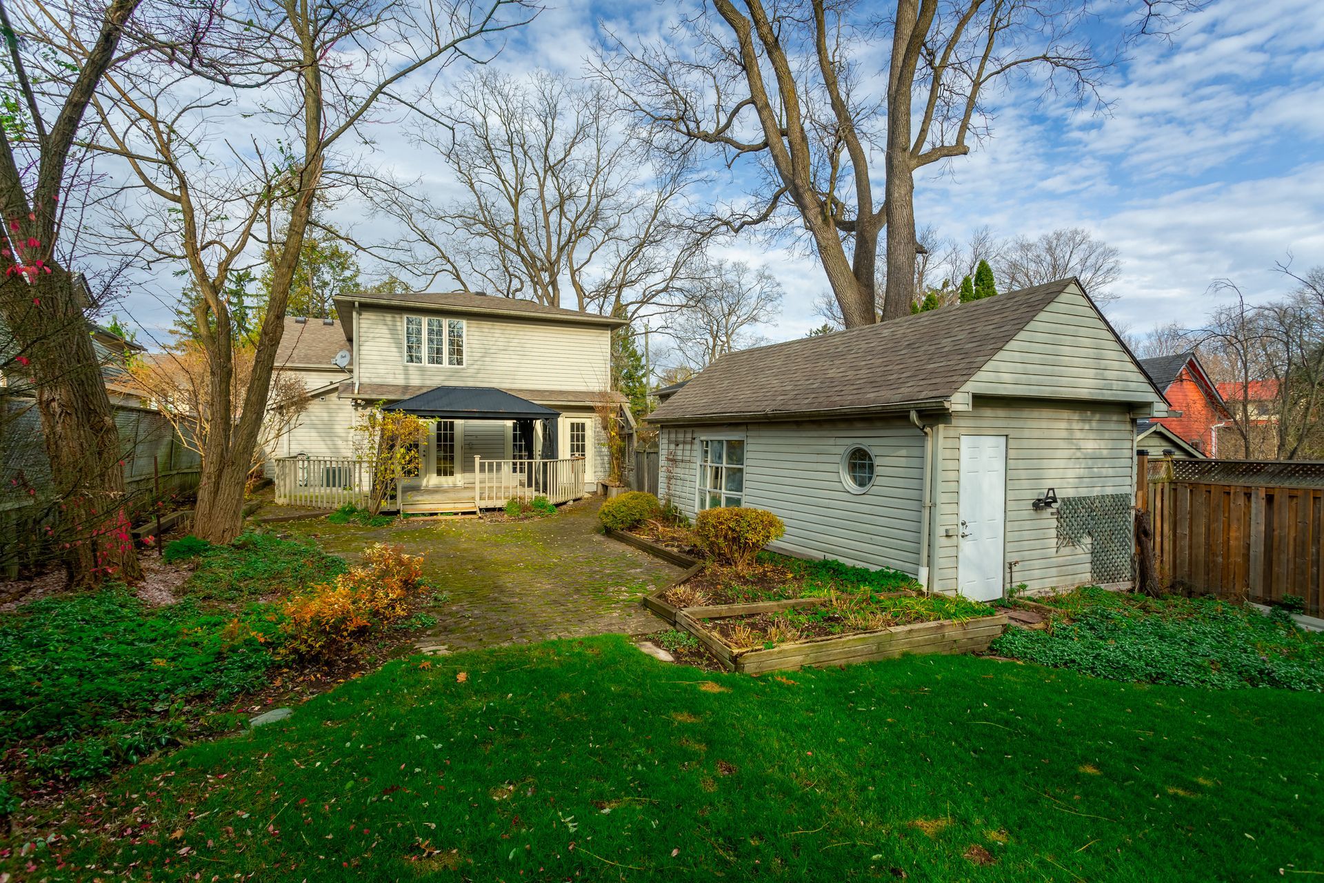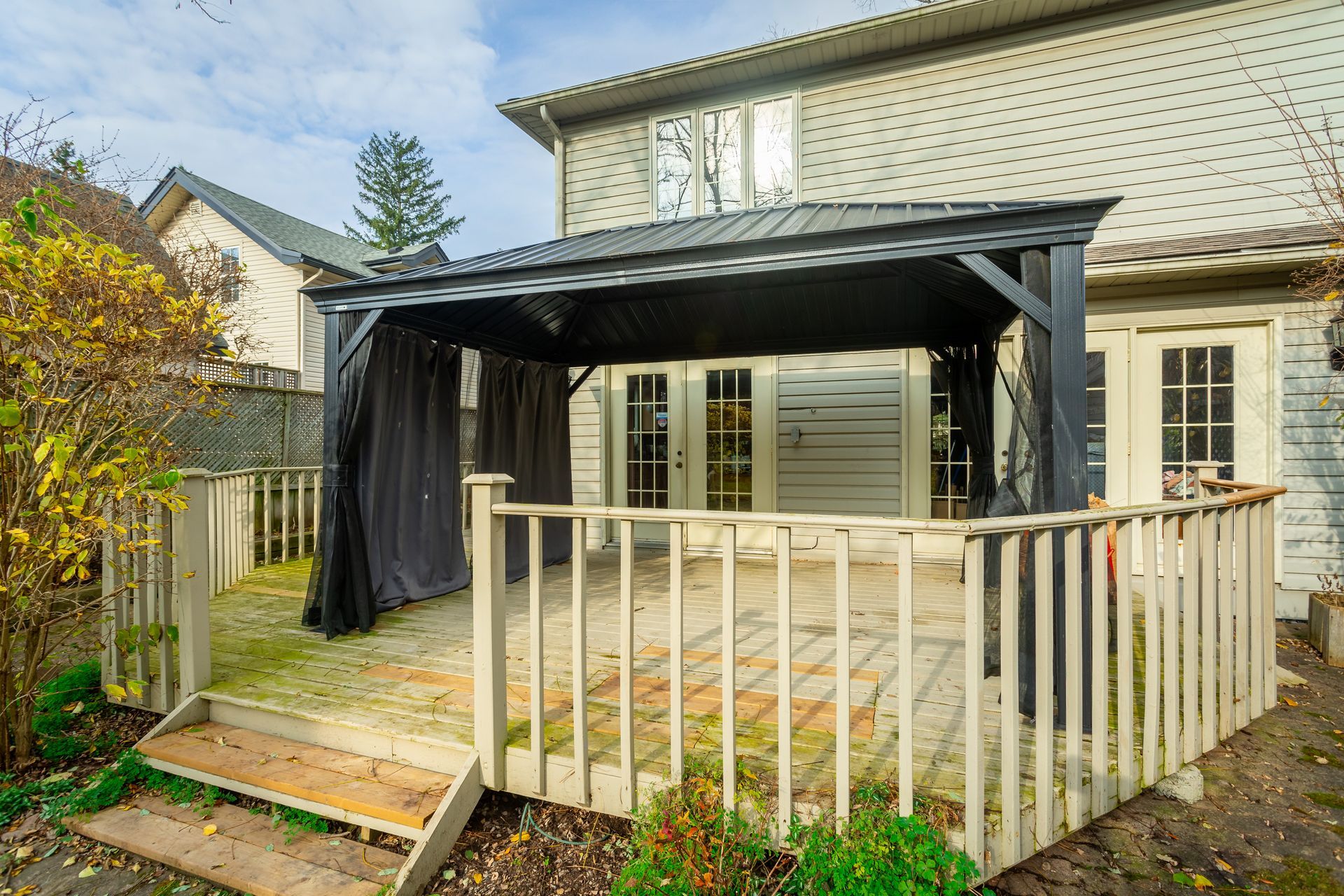 This well landscaped and fully fenced private backyard also has a gazebo and natural gas hook up on the deck with sliding glass doors from the kitchen.